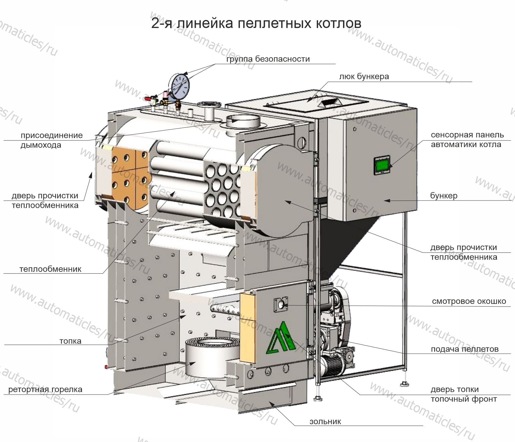 В котлах используется самоочищающаяся ретортная горелка, которая выполнена под оптимальный расход пеллет и минимальный остаток золы, что позволяет использовать гранулы повышенной зольности до 15%, в отличии от другого способа их сжигания. Уникальная конструкция подачи вторичного воздуха, а также использование в пеллетных котлах катализатора, позволяет добиться полного и качественного режима горения топлива с получением высокого КПД, не менее 85%. В корпусе котла предусмотрены люки для его обслуживания. Рабочее давление в водяной системе до 0,3 МПа (3 кг/см2) ограничено предохранительным клапаном. На выходе из теплообменника в его верхней части установлена группа безопасности, в состав которой входят предохранительный клапан, манометр и шаровой кран. Предохранительный клапан служит для выпуска из котла излишков пара (воды) при повышении давления выше расчетного. Манометр служит для контроля давления в теплообменнике.